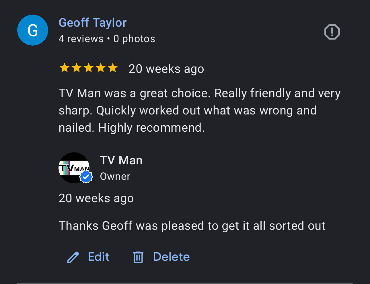 TV Man was a great choice. Really friendly and very sharp. Quickly worked out what was wrong and nailed. Highly recommend
